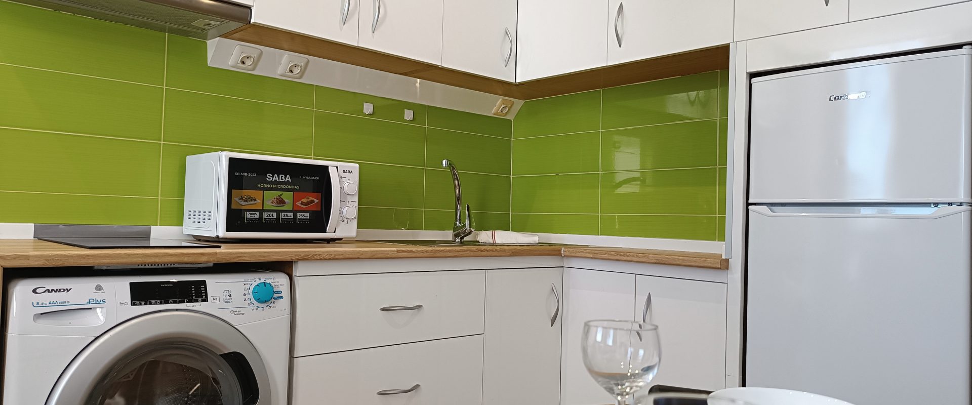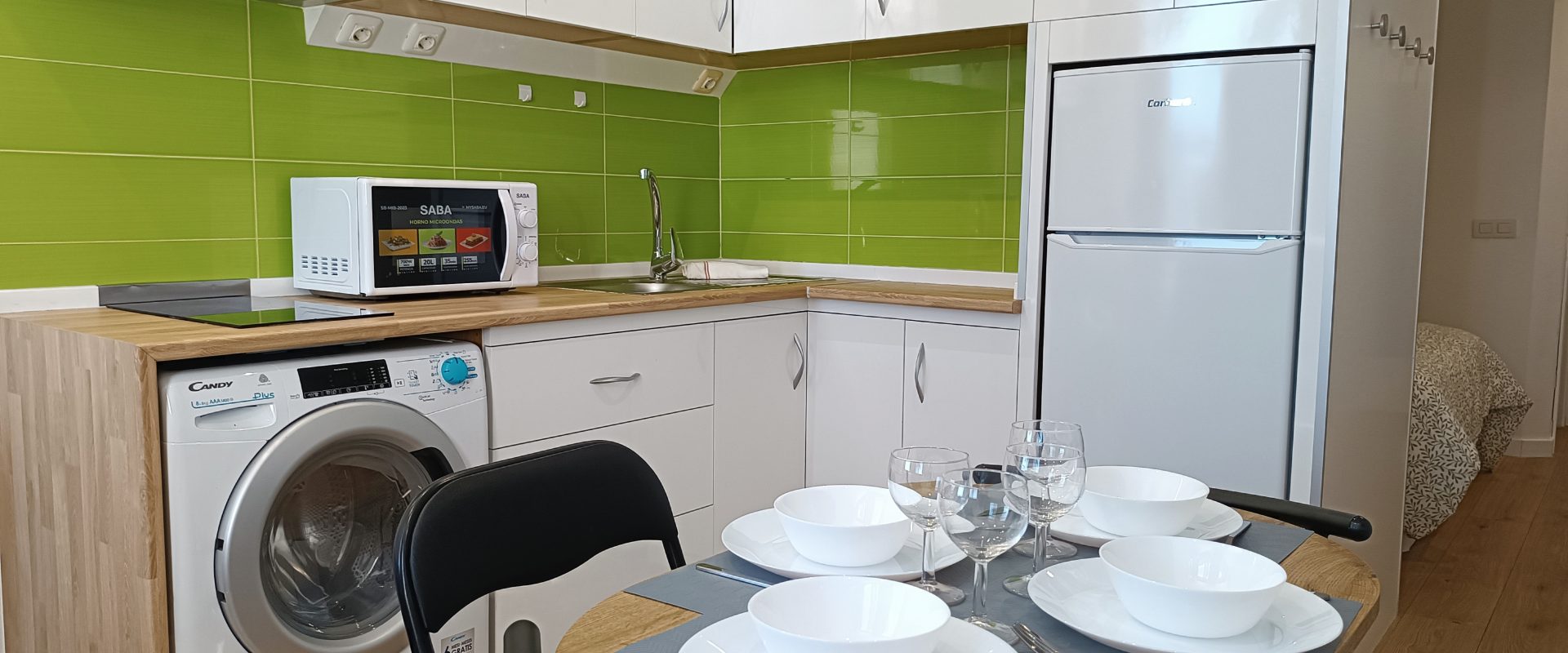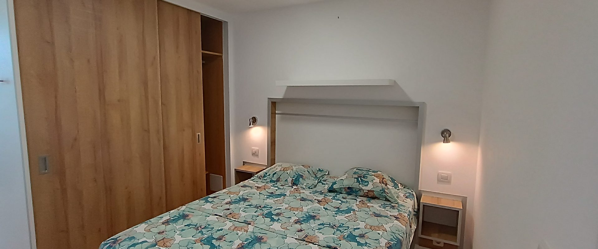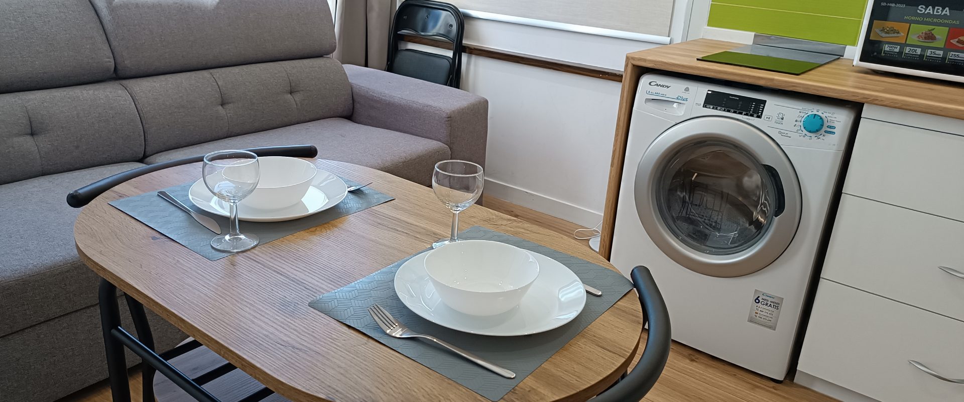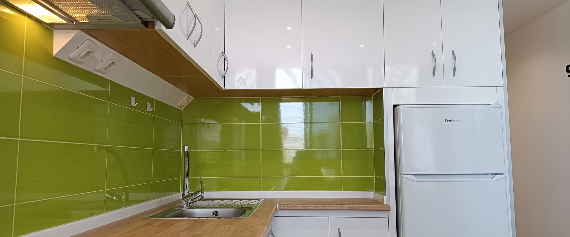 This studio apartment is perfect for those seeking a modern and bright space. The living room window lets in plenty of natural light and offers a lovely view of the pool. The open-plan kitchen connected to the living area creates a cozy and functional atmosphere. The bedroom, separated by a wall, blends seamlessly into the open layout of the apartment.